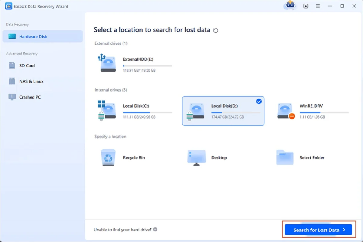 Puede usar una herramienta profesional como Easeus Data Recovery Wizard para recuperar datos de un disco duro. Esta herramienta profesional ayuda a escanear el disco y restaurar los archivos a una nueva ubicación.