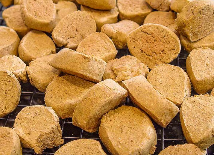 Corta las galletas con moldes de formas divertidas y colócalas en la bandeja de horno. Hornea durante 20-25 minutos o hasta que las galletas estén doradas y crujientes. Deja enfriar completamente antes de dárselas a tu perro.