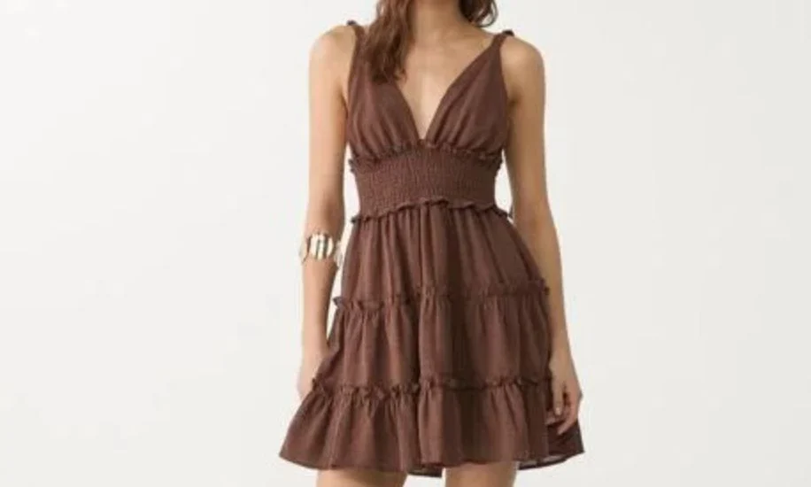 El color marrón ha regresado con fuerza esta primavera, y Stradivarius lo ha incorporado a su catálogo con acierto. Este vestido marrón con volantes es perfecto para salidas, citas o incluso eventos de día. Combina elegancia y comodidad en partes iguales, y se ve increíble con accesorios dorados o beige.