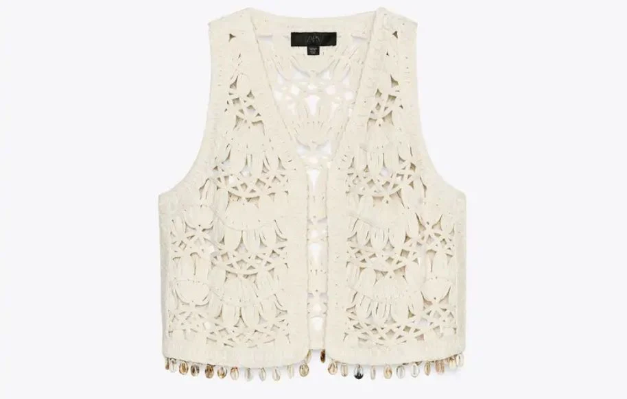 Un chaleco con una aplicación de conchas de mar en los bajos resulta la prenda perfecta para que disfrutes de una gran noche de verano. Lo puedes combinar con lo que quieras y siempre quedará bien.