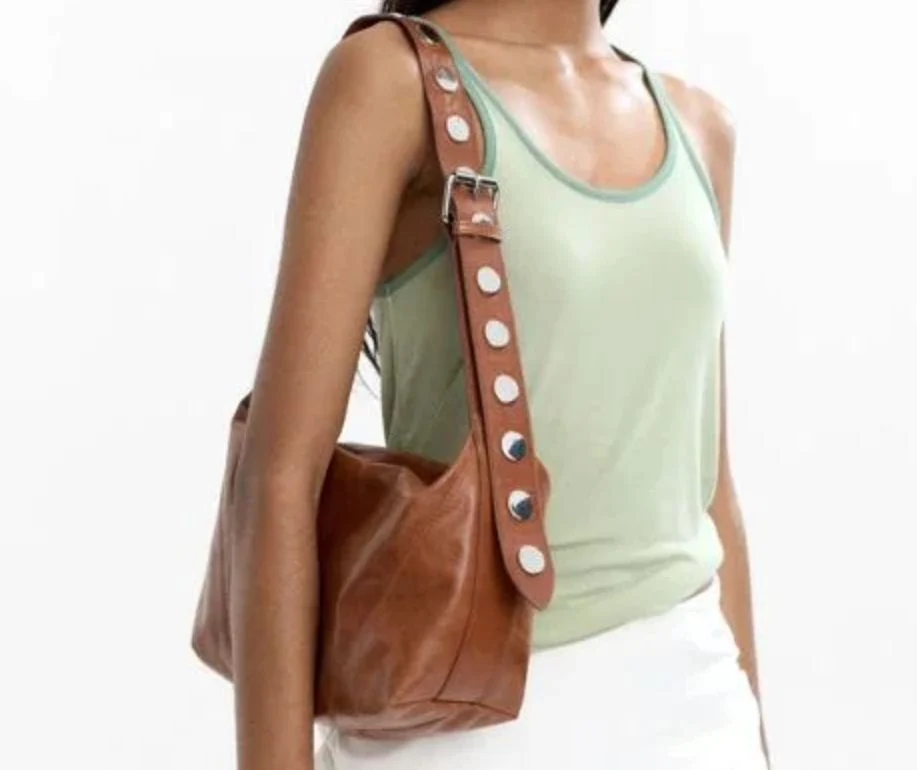 Para darle un toque final, un bolso marrón (69,99 euros) con tachuelas será el complemento perfecto. Este bolso es lo suficientemente versátil como para llevarlo tanto al trabajo como a una cita o una tarde de compras.