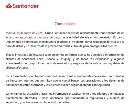 «Lamentamos la situación y estamos informando proactivamente a los clientes y empleados directamente afectados. Hemos notificado oportunamente a reguladores y fuerzas de seguridad, y continuaremos colaborando con ellos», señalaban desde Banco Santander en su día en un comunicado publicado en su página web, redes sociales, y enviado a los clientes de la entidad financiera.