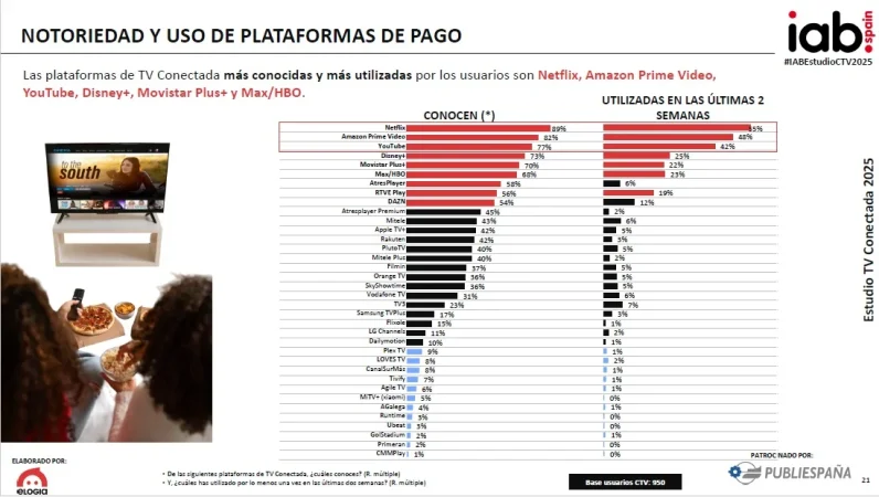 En cuanto a las plataformas que triunfan en la tele por internet en España, las más conocidas y más utilizadas por los usuarios son Netflix (con un 89% de los preguntados que la conocen y un 55% que la utilizan), luego Amazon Prime Video, YouTube, Disney+, Movistar Plus+ y Max/HBO. Entre las plataformas de pago, Netflix y Amazon Prime Video «se posicionan como las más contratadas actualmente», según concluye el estudio.