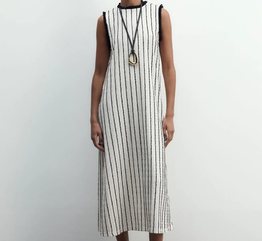 Las rayas nunca pasan de moda, y este vestido recto de rayas blancas y negras es la prueba de ello. Disponible por 25,99 euros, es una de esas prendas que no necesitan presentación porque hablan por sí solas.
