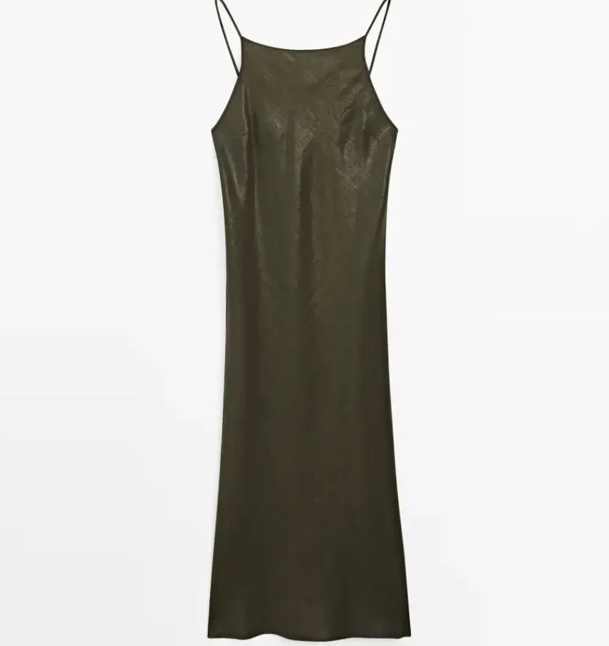 ¿Buscas un vestido base para todo el verano? Este vestido verde satinado es lo que necesitas. Su acabado metalizado le da una textura especial que lo hace destacar entre otros vestidos de satén. Es una opción fresca, cómoda y elegante al mismo tiempo, perfecta para cualquier ocasión, desde una salida casual hasta un evento un poco más arreglado.