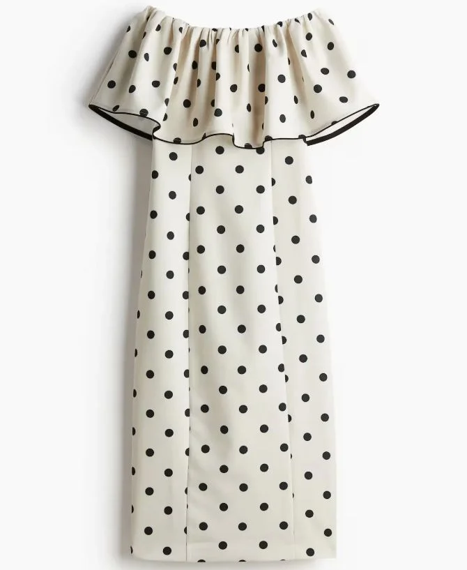 Este vestido tipo Bardot es otro de los grandes éxitos de la temporada. Su escote en V pronunciado, combinado con manguita de volante y su tecido transparente, lo convierte en una opción muy sofisticada para cualquier evento especial. Su estampado floral es ideal para las que buscan un look elegante, pero con un toque de frescura.