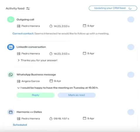 Harmonix sí lo hace. Centraliza llamadas, emails, WhatsApp, LinkedIn, y más, en un único espacio conectado y accionable.