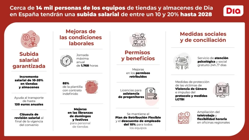 En este contexto, la compañía de distribución española, y los sindicatos Fetico, CC. OO. y UGT han firmado un nuevo acuerdo que supone una subida salarial del 10% al 20% para cerca de 14.000 personas de los equipos de tiendas y almacenes hasta 2028. El nuevo acuerdo, que tendrá vigencia hasta finales de 2028, reafirma la apuesta de Dia por sus equipos, asegurando su estabilidad y mejorando sus condiciones laborales.