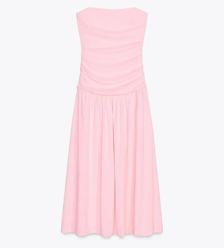 El rosa pastel ha sido uno de los colores protagonistas de las pasarelas primavera/verano 2025. Este vestido con frunces de Zara no solo resalta el color, sino que también marca la figura, dándole un toque femenino y muy estilizado. ¡Perfecto para las tardes calurosas de verano!