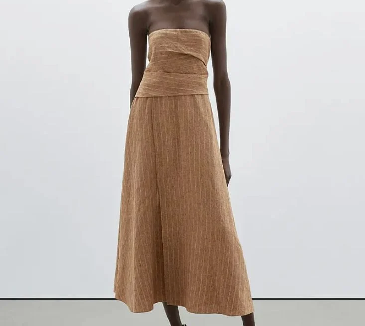 El escote palabra de honor ha vuelto con fuerza esta temporada, y este vestido en marrón arena es la prueba de ello. Su diseño es elegante y sofisticado, con un patrón de rayas que le da un toque único. Es ideal para cualquier evento nocturno, pero también es lo suficientemente versátil para usarlo durante el día.