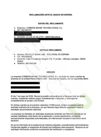 Ante la inexistente respuesta de Revolut, Forte ya se ha cansado de esperar tras una semana sin su dinero y la cuenta bloqueada. «Ahora lo que voy a hacer es denunciar al Banco de España, poniendo una instancia. Y, también voy a ir a denunciar a Revolut a la Policía por apropiación indebida. Una empresa no puede congelar fondos de otra sin explicación ni contacto humano».