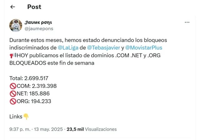 Este paso lo dan después de haber «agotado todas las vías legales a nuestro alcance para hacerle entender al juez que su decisión, en favor de La Liga y Telefónica, de bloquear páginas web y restringir el acceso a usuarios legítimos representa una grave anomalía en un Estado democrático», según una comunicación hecha pública en la red social X.