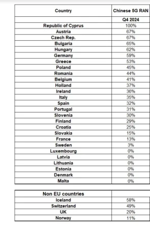 el 67% de la infraestructura 5G de Austria proviene de China, como el 65 % de la infraestructura 5G de Bulgaria, el 62% de Hungría,