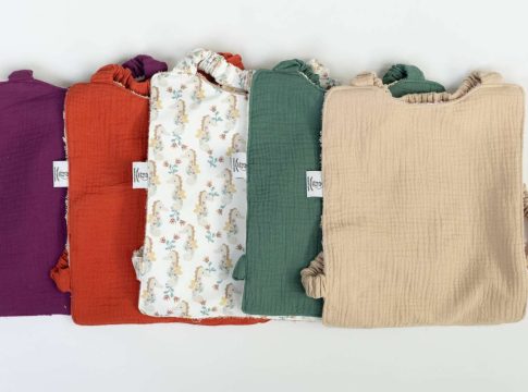 La colección actual incluye más de siete diseños fabricados en algodón con rizo suave y una capa impermeable oculta. Todas las piezas son aptas para lavadora y secadora. El diseño y la confección se realizan en talleres locales, lo que convierte cada babero en una pieza singular dentro de una propuesta cuidada y exclusiva.