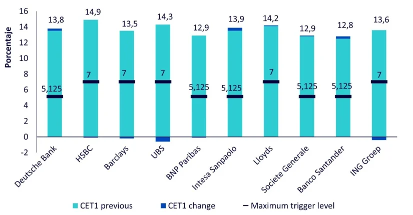 Gráfica 1: los 10 principales emisores de CoCos AT1 con ratios CET1, y emisores de Cocos AT1 con reservas o colchones CET1 en base al nivel máximo de activación.