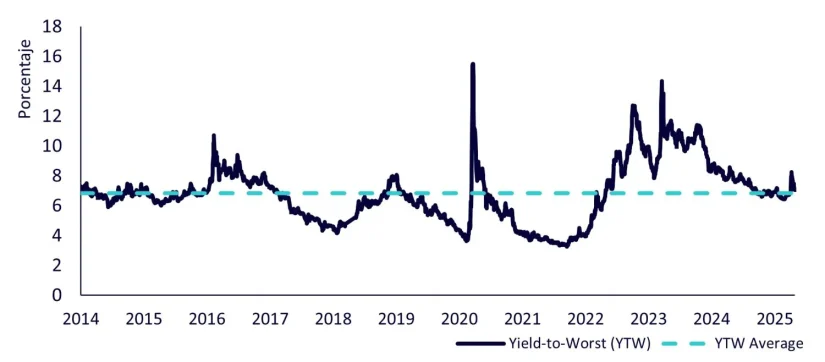 Fuente: WisdomTree, Markit. Periodo comprendido entre el 2 de enero de 2014 y el 28 de abril de 2025. Los cálculos incluyen datos contrastados. YTW es el rendimiento a peor comunicado por Markit y se basa en la ponderación del valor de mercado ajustado a la duración.