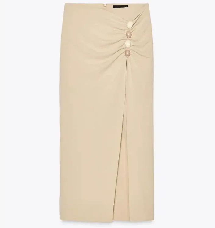 De esas faldas que parecen sacadas de un resort de lujo. Zara ha creado una joyita con un detalle en piedras en la cintura que disimula la tripita y realza la silueta sin marcar.