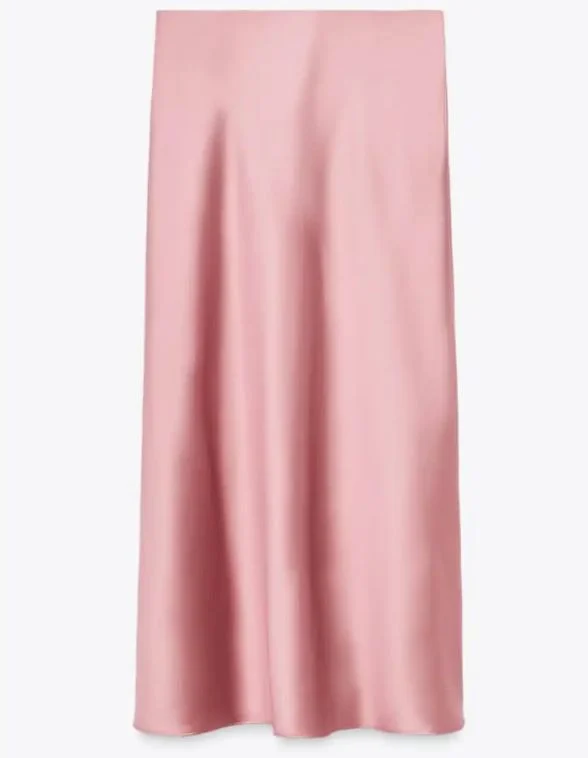 Una prenda sencilla, pero con mucho efecto. Esta falda satinada en rosa empolvado tiene un corte al bies que abraza la figura sin marcar y alarga visualmente las piernas.