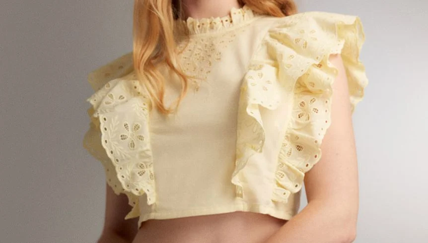 El amarillo mantequilla está en tendencia y esta blusa lo aprovecha al máximo. Con volantes en las mangas tipo mariposa y detalles calados, resulta ideal para llevarla con pantalones blancos de tiro alto.