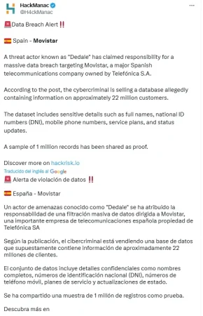 Durante el fin de semana, el hacker @ReyXBF publicó dos tuits de advertencia en su cuenta de X a la operadora española de haber conseguido introducir un ransomware en la compañía. Hasta el momento no se ha confirmado este ataque y el actor malicioso ha borrado ambos tuits, pero según los expertos «habrá que esperar lo que trascienda en los próximos días».