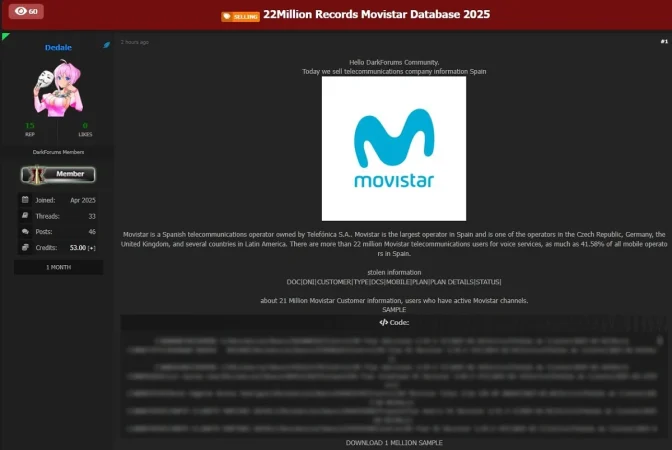 Telefónica ha sido de nuevo atacada por los ciberdelincuentes. Mientras este lunes se hacía pública la advertencia del cibercriminal ‘Dedale’ que aseguraba haber hackeado a Movistar y conseguir el acceso de forma ilícita a 22 millones de registros de clientes y de los que a modo de prueba filtró una base de datos con 1 millón de registros.