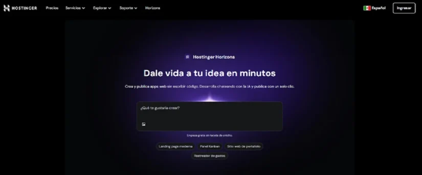 Hostinger Horizons es una herramienta impulsada por inteligencia artificial que te ayuda a crear sitios web o aplicaciones sin necesidad de programar. Lo único que necesitas es una idea clara: le cuentas al chatbot lo que quieres hacer y, en pocos segundos, tienes una primera versión lista para usar.