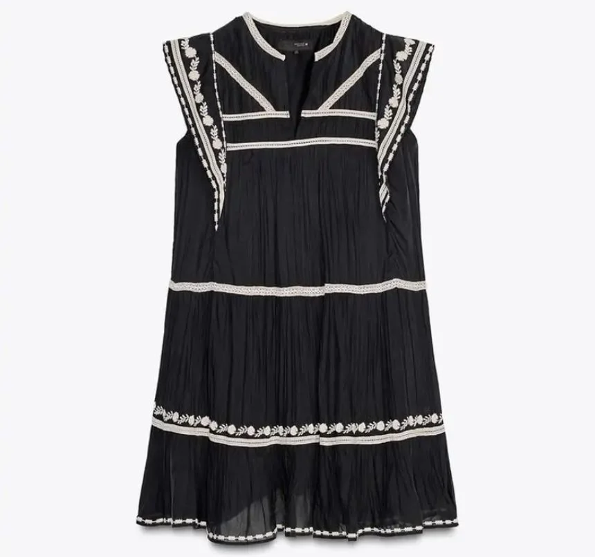 Los bordados blancos a contraste sobre fondo negro le dan a este vestido ese aire preppy y artesanal que tanto enamora. Ideal para las más coquetas, va perfecto con alpargatas y un capazo de rafia. Una opción elegante, juvenil y con mucho encanto.