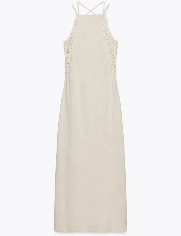 Si te gustan los detalles románticos, este vestido es para ti. Confeccionado en lino y remates de crochet, destaca por su espalda descubierta, ideal para realzar el bronceado. Es de esas piezas que no necesitan mucho más: con unas sandalias planas y un bolso de mimbre, estás lista.