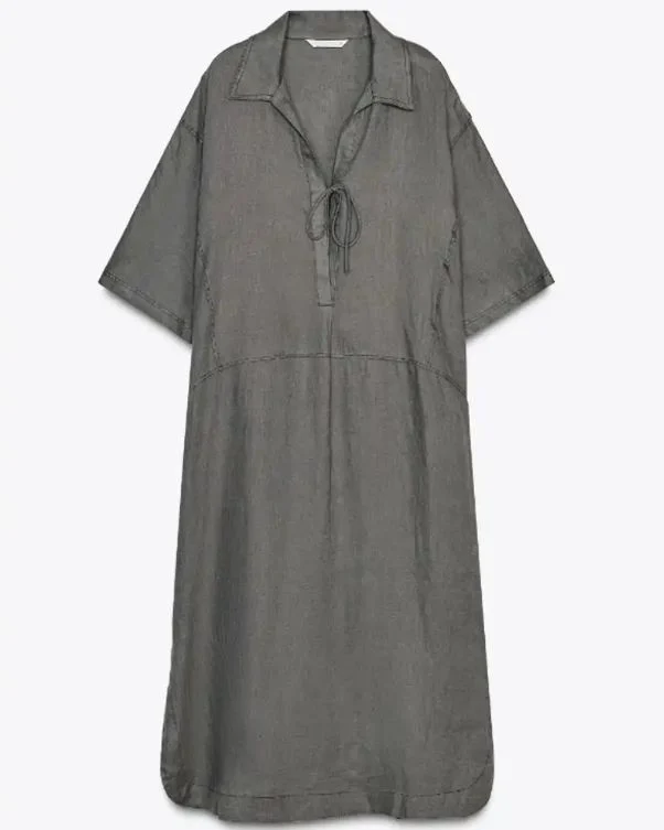 A veces, menos es más, y este caftán gris antracita es prueba de ello. Su diseño es sobrio, pero no por eso menos impactante: corte relajado, escote con lazada y textura suave lo convierten en una pieza de fondo de armario vacacional.