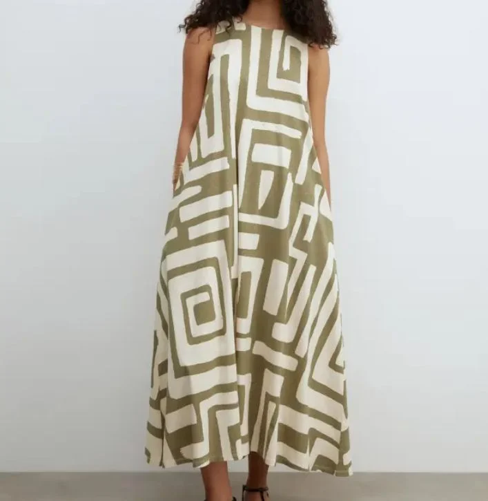 Corte evasé, sin mangas y bolsillos laterales —una combinación ganadora para combatir el calor sin renunciar a la comodidad. Al no ir ceñido, permite la circulación de aire y no marca zonas conflictivas. Combínalo con sandalias tipo gladiador de caña alta o con zapatillas blancas para un street style cómodo y juvenil.