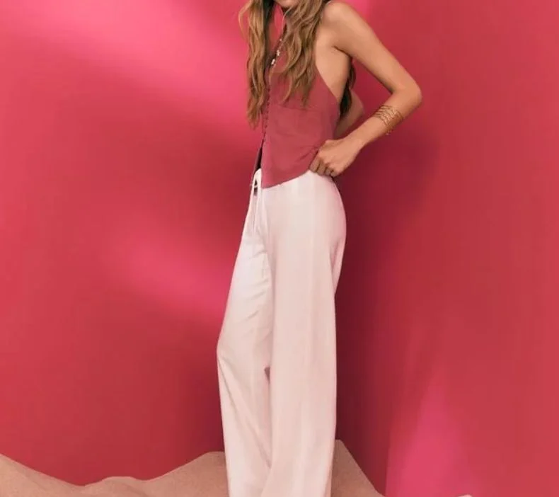 Entre las prendas más prácticas del armario veraniego, el pantalón blanco fluido (25,99 euros) es probablemente uno de los más recurrentes. Stradivarius propone un modelo con cintura elástica, pernera ancha y bolsillos laterales, que se adapta a cualquier situación: desde una comida informal hasta una tarde de compras o un paseo por la playa.