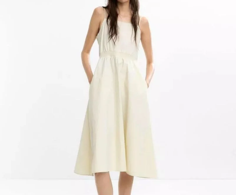 Un clásico reinventado que no puede faltar en tu armario. Este vestido midi es ligero y fresco, perfecto para el verano. Los tirantes finos le dan un toque delicado y el corte favorece a cualquier silueta, mientras que el drapeado ayuda a definir la cintura. Lo puedes combinar con sandalias para un look informal o con tacones y accesorios para un evento más elegante.