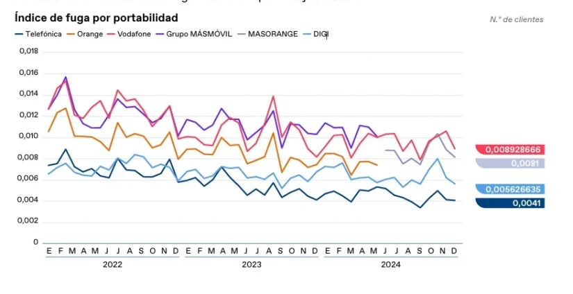 es Telefónica quien cuenta con el índice de fuga más bajo del sector «con una ratio de 4,44 ‰» de abandono de clientes, es decir, que tiene los clientes más fieles del mercado español