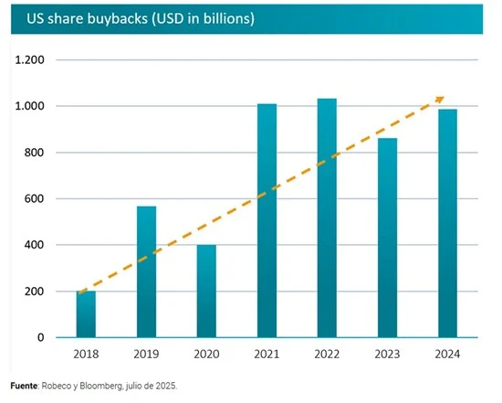 Las recompras de acciones han aumentado su valor hasta alcanzar 1 billón de dólares al año en EE.UU. desde 2021, cumpliendo un doble propósito ahorrando la necesidad de liquidez para el pago de dividendos y también, aumentando artificialmente los beneficios por acción y el propio precio de la acción. También tienen ventajas fiscales en determinadas jurisdicciones.