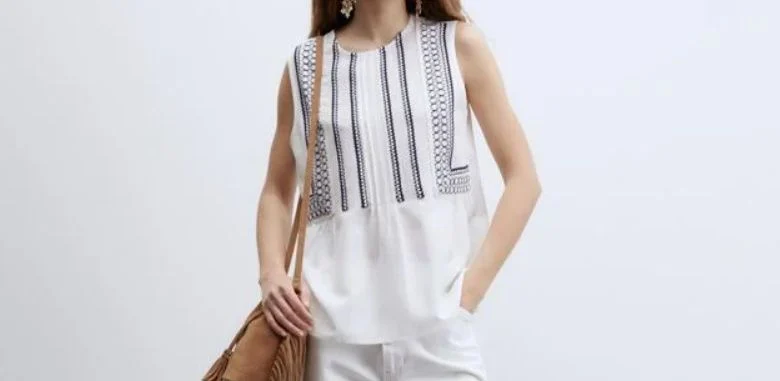 La blusa blanca con puntilla bordada es un claro ejemplo de cómo una prenda sencilla puede convertirse en un comodín estiloso. Gracias a su corte fluido y sin mangas, permite libertad de movimiento y frescura. Puedes combinarla con pantalones de lino o jeans rectos para un look urbano, o con una falda midi si buscas algo más formal.
