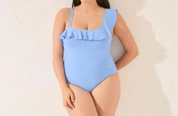 El bañador asimétrico azul con volantes es otro de los diseños destacados. ¿Por qué? Porque está pensado para realzar la zona superior del cuerpo de una forma natural y estética. Los volantes en el pecho añaden volumen, por lo que es ideal si quieres equilibrar la silueta o destacar el escote de forma sutil.