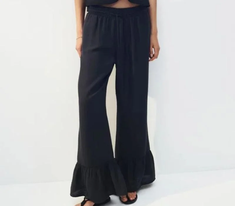 Si estás buscando un pantalón que sea cómodo, ligero y bonito, este modelo fluido con volantes en el bajo es la opción perfecta. Disponible en blanco y negro, se adapta a cualquier tipo de combinación y resulta ideal para usar tanto de día como de noche. Tiene cintura elástica, lo que lo hace muy fácil de llevar incluso en días de mucho movimiento. Puedes armar un conjunto completo con una blusa romántica o un top de textura.