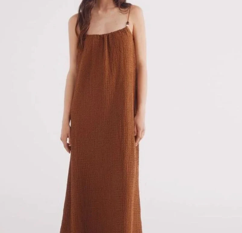Si eres más de tonos neutros y quieres un look sofisticado y sin esfuerzo, este vestido largo en tono marrón chocolate es perfecto. Está confeccionado con un tejido texturizado, tiene escote recto con fruncido y tirantes finos tipo espagueti decorados con cuentas.