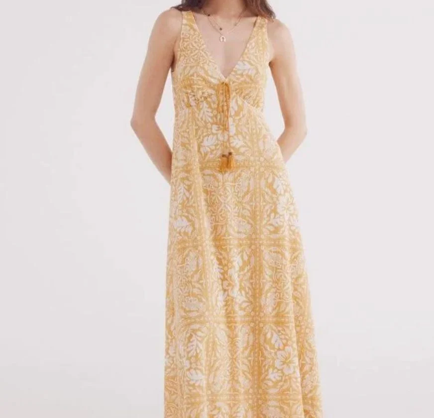 Cerramos esta lista con un modelo que combina comodidad, frescura y un toque bohemio. Este vestido largo con estampado en tono mostaza tiene tirantes anchos, escote en pico y detalles de fruncido bajo el pecho que lo hacen más favorecedor.