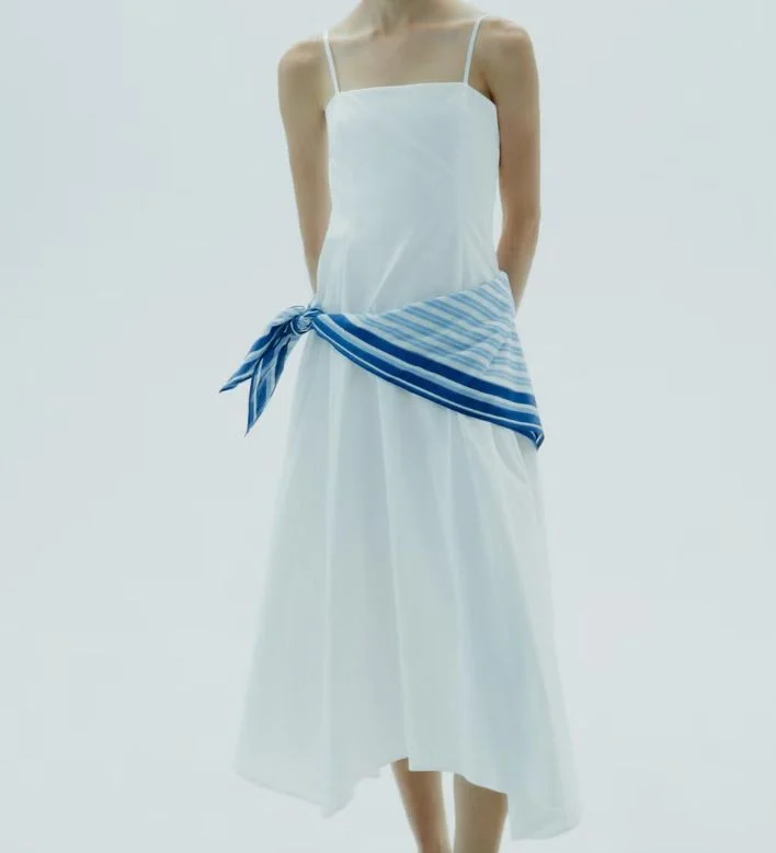 Cuando se piensa en verano, el blanco acude a la mente de inmediato. Zara lo sabe y ha incluido varias versiones irresistibles. Una de las más originales incorpora de serie un pañuelo anudado a la cadera, un recurso que recuerda al estilismo playero de los años setenta. Ese nudo no es meramente decorativo: rompe la verticalidad del vestido y marca la cintura de forma sutil, algo muy útil para alargar la figura sin recurrir a cinturones rígidos.