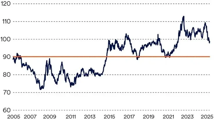 Fuente: LSEG Datastream, 12 de junio de 2025. El US Dollar Index mide el valor del dólar estadounidense frente al euro, el yen, la libra esterlina, el dólar canadiense, la corona sueca y el franco suizo.