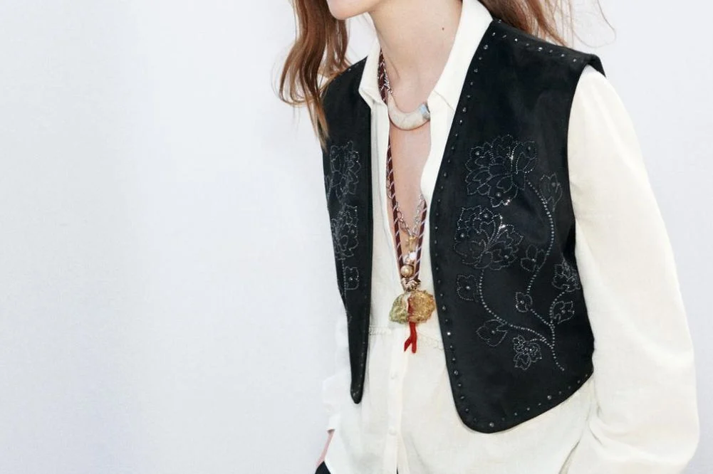 Sí, el estilo bohemio también puede tener su versión más nocturna y cañera. Este chaleco de Zara lo demuestra con creces. En negro profundo, con efecto ante y unos sutiles detalles brillantes, es perfecto para las que quieren marcar estilo con un toque más glam.