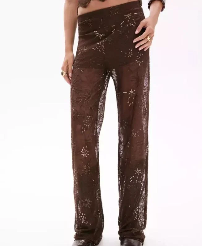 Si los shorts no son lo tuyo o buscas una opción más llamativa, el pantalón fluido con bordados y lentejuelas es ideal. Por 25,99 euros, Stradivarius ofrece esta prenda ligera y cómoda con detalles brillantes que hacen que resalte en cualquier entorno. Puedes combinarlo con un top básico o con alguna prenda de lentejuelas si quieres un total look más atrevido. Aporta movimiento, frescura y un punto elegante que encaja muy bien con los festivales de tarde-noche.