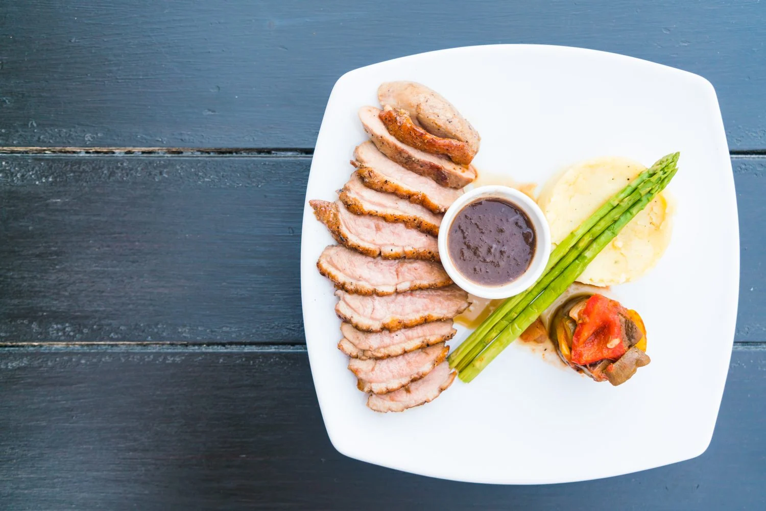 Deja reposar el pato unos 10–15 minutos. Luego separa la piel crujiente (servida como primer plato con azúcar o salsa dulce) de la carne, que se corta en finas rebanadas junto con algo de piel y grasa para textura.