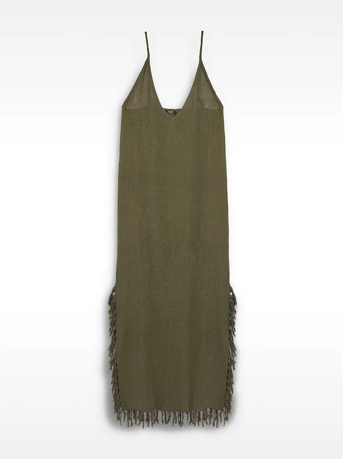 Según los especialistas de la moda, los flecos siempre llaman la atención. Y es justamente ese detalle el que destaca en uno de los vestidos más boho de la temporada: el vestido largo verde caqui con flecos, confeccionado en lino, que Parfois ofrece por solo 29,99 euros.