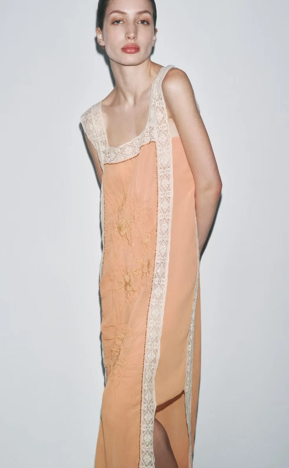Los vestidos midi con detalles de inspiración lencera están protagonizando los escaparates de Zara este verano. El más buscado —y también uno de los más vendidos de la temporada— es un diseño con escote recto, tirantes anchos y aberturas laterales en el bajo. Pero lo que lo hace realmente especial son sus detalles de bordados, puntilla en contraste y una estructura que realza la silueta sin ceñirla.
