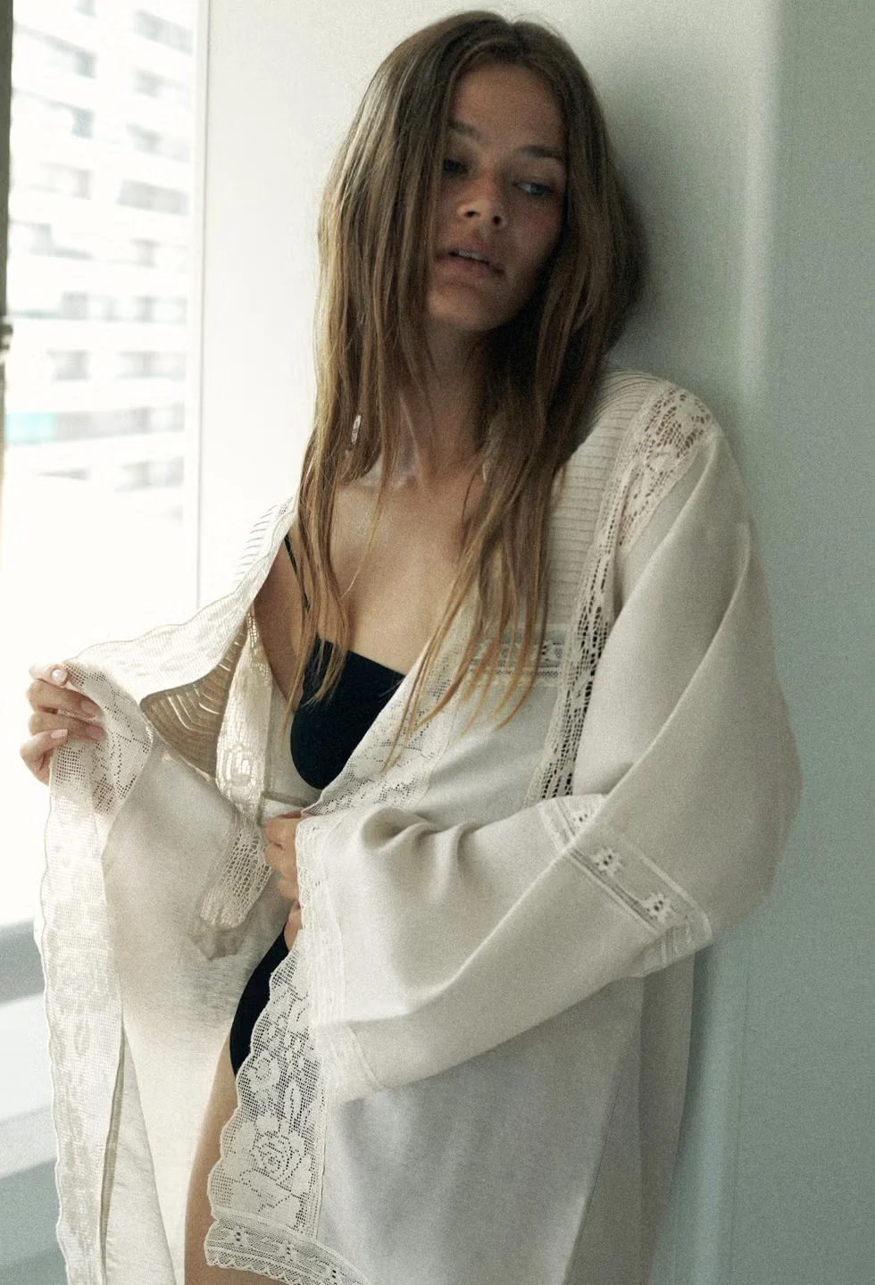 Si hay una prenda que resume a la perfección la tendencia ‘lingerie as outerwear’, esa es la bata estilo kimono que Zara ha incluido en su colección limitada. Lejos de ser una pieza exclusiva para casa, esta bata abierta está confeccionada en mezcla de tejidos y lino, lo que le otorga un movimiento y caída que enamoran.