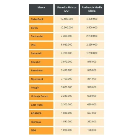 Asimismo, ambas entidades financieras dominan en audiencia media diaria, situándose las dos compañías por encima de los 3,5 millones de visitantes diarios. Tanto BBVA como CaixaBank se posicionan también como las entidades con mayor tiempo de permanencia mensual, es decir, 43 minutos al mes en el caso de CaixaBank y 36 minutos al mes en el caso de BBVA.