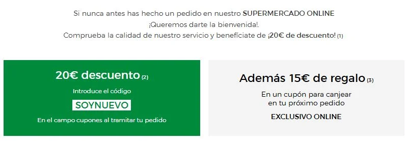 En segundo lugar, nos encontramos con El Corte Inglés, que ahora mismo a puesto fin a su promoción online, pero estaba ofreciendo a los clientes 20 euros de regalo en sus compras por internet, eso sí, de alimentación. Tan solo podrán aprovechar el descuento aquellos que todavía no sean del club de clientes de El Corte Inglés, ya que su intención es darles la bienvenida y que, como bien señalan, «comprueben la calidad de nuestro servicio».