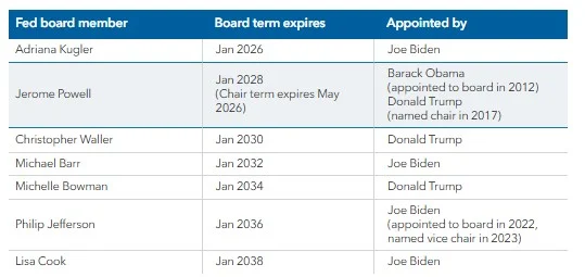 Aunque el mandato actual de Powell como presidente de la Fed expira en mayo de 2026, tiene la opción de permanecer en la junta de siete miembros hasta enero de 2028. Además, hay cinco miembros con derecho a voto del Comité Federal de Mercados Abiertos (FOMC) procedentes de bancos regionales de la Fed que son nombrados por sus respectivos distritos. La junta de la Fed tiene la facultad de reelegir a Powell como presidente del FOMC, que fija los tipos de interés. Podrían hacerlo independientemente de a quién confirme el Senado como presidente de la junta, aunque esa medida no tendría precedentes.